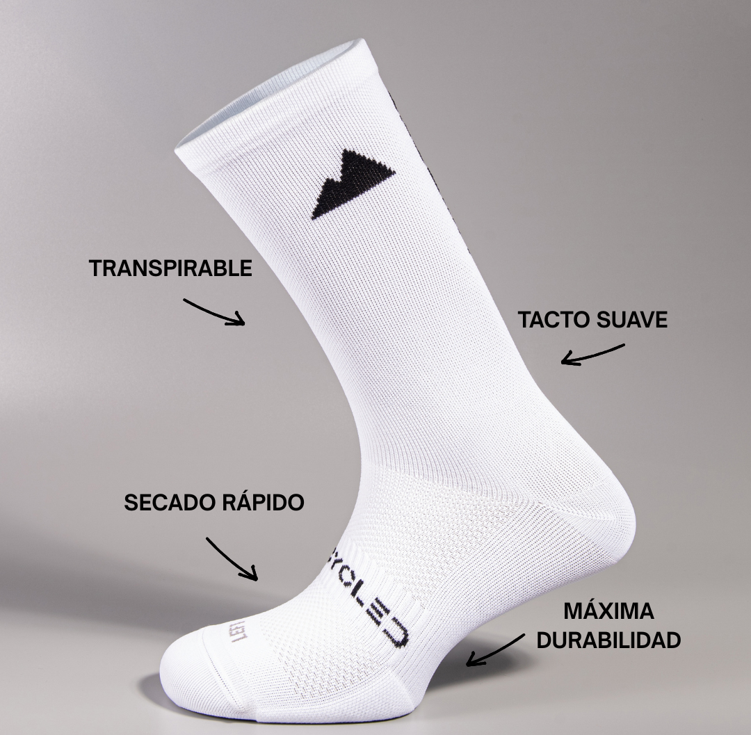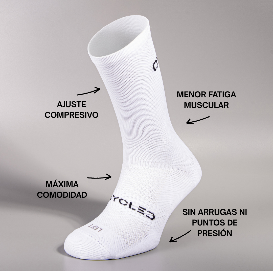 Diseñados para moverse contigo, los calcetines de ciclismo CYCLED combinan una compresión ligera y uniforme con una puntera preformada anatómica, logrando un ajuste natural que acompaña el movimiento del pie sin generar presión ni fricción.